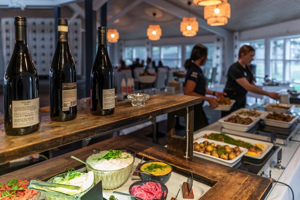 Midsommarbuffén serveras båda dagarna kl. 16:00–19:00 och du hittar exempelvis lax, sill, kött, nypotatis, såser, sallader, bröd och somriga desserter på vårt bord!